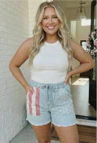 These casual shorts bring a faded vintage flag print to life in a relaxed, everyday silhouette. Built with a soft fleece-like fabric and an elastic drawstring waist, they sit comfortably and move with you all day. Perfect for warm weather gatherings, holiday weekends, and laid back summer days.